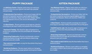 Puppy and kitten packages are discounted to get each new pet off to a healthy start! Learn more about your new furry family members’ wellness and development.